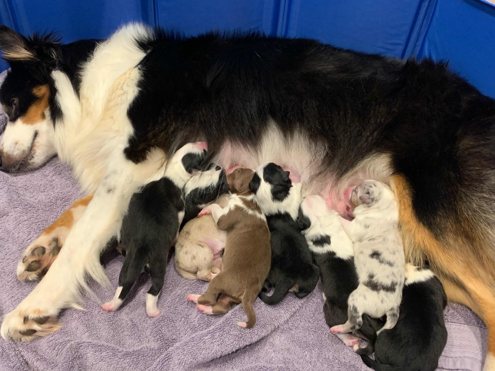 Yesterday at 4pm, John and the Pomegranate got a “puppy count” at the vet. Eight! And then, this morning, Hannah wandered downstairs at 3am and there were already 3 little puppies present. The remaining five followed soon after, and it was an uneventful delivery.
