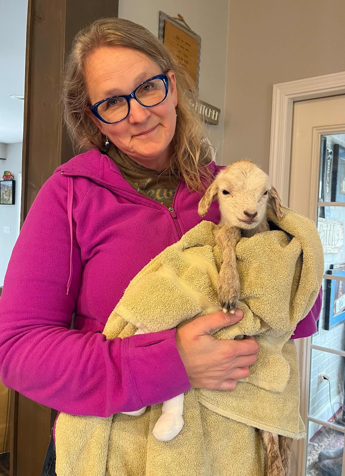 She was mighty cute and spotted but pretty little. I decided to grab some hay, make her a warm spot, and take off for church and see how she was after church. The good news was, after church she was standing. But the Mama was nowhere to be found. The weather was nasty. Cold and incredibly windy. She was already shaking so I knew chances of survival without food in her was low. (You can feel a baby lamb's stomach and feel pretty confident about whether they are eating or not.) If the weather had been better, I might have tried to find Mama and do a test, but I just didn't have it in me, and it was obvious baby didn't either.