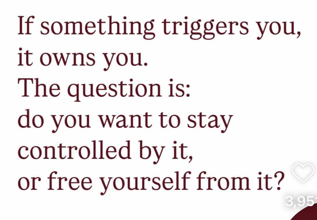 The truth is, if something triggers you, the "fault" lies with you. The need to fix it lies with YOU. You are being triggered and the trigger owns you. And it doesn't have to keep triggering you! You don't have to live with this forever.